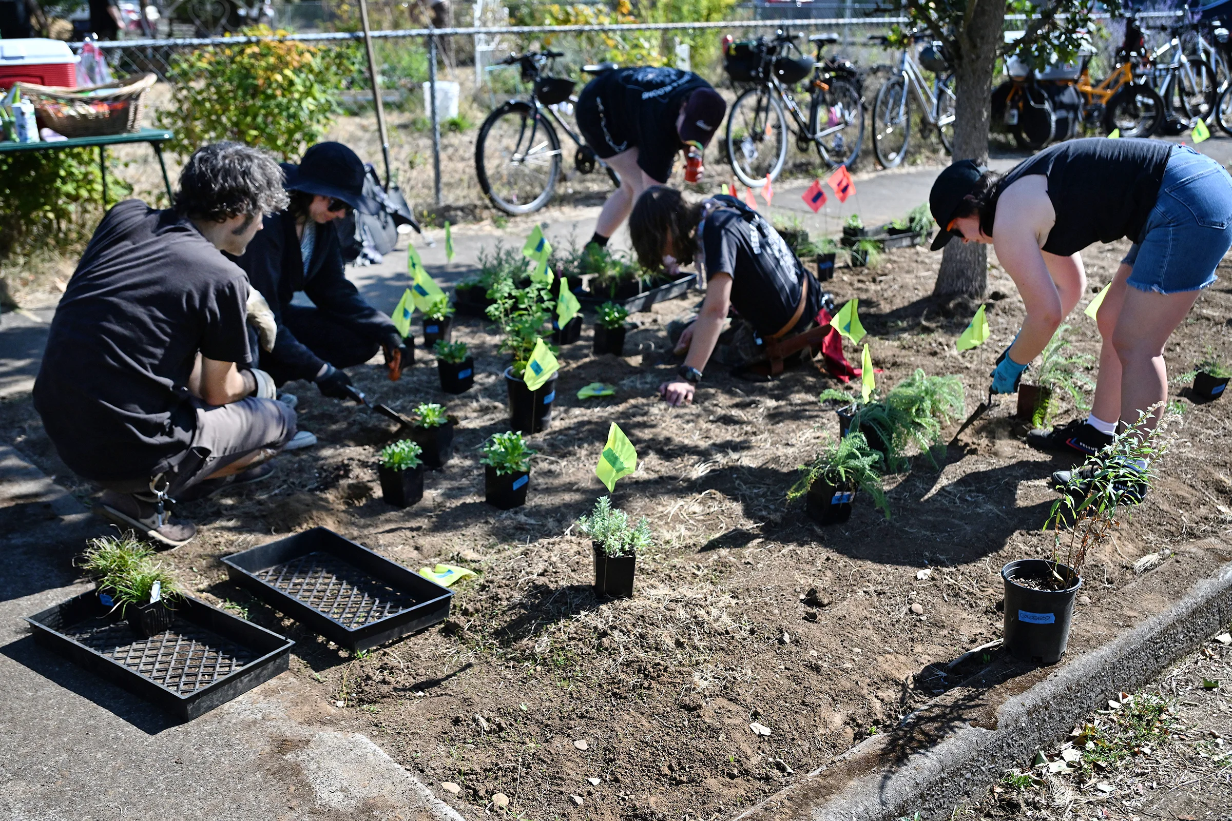 Each year we choose two to three homeowners to assist in transitioning their spaces with native plants, prioritizing homeowners from marginalized communities. With the help of enthusiastic bicyclist volunteers, we transport and plant hundreds of native plants over the course of a day. After planting, we install a sign with a QR code so that people passing by can scan and learn about the plant species, their growing requirements, and their environmental benefits. To ensure long term success of the planting, we assist with maintenance for the first several years after planting.