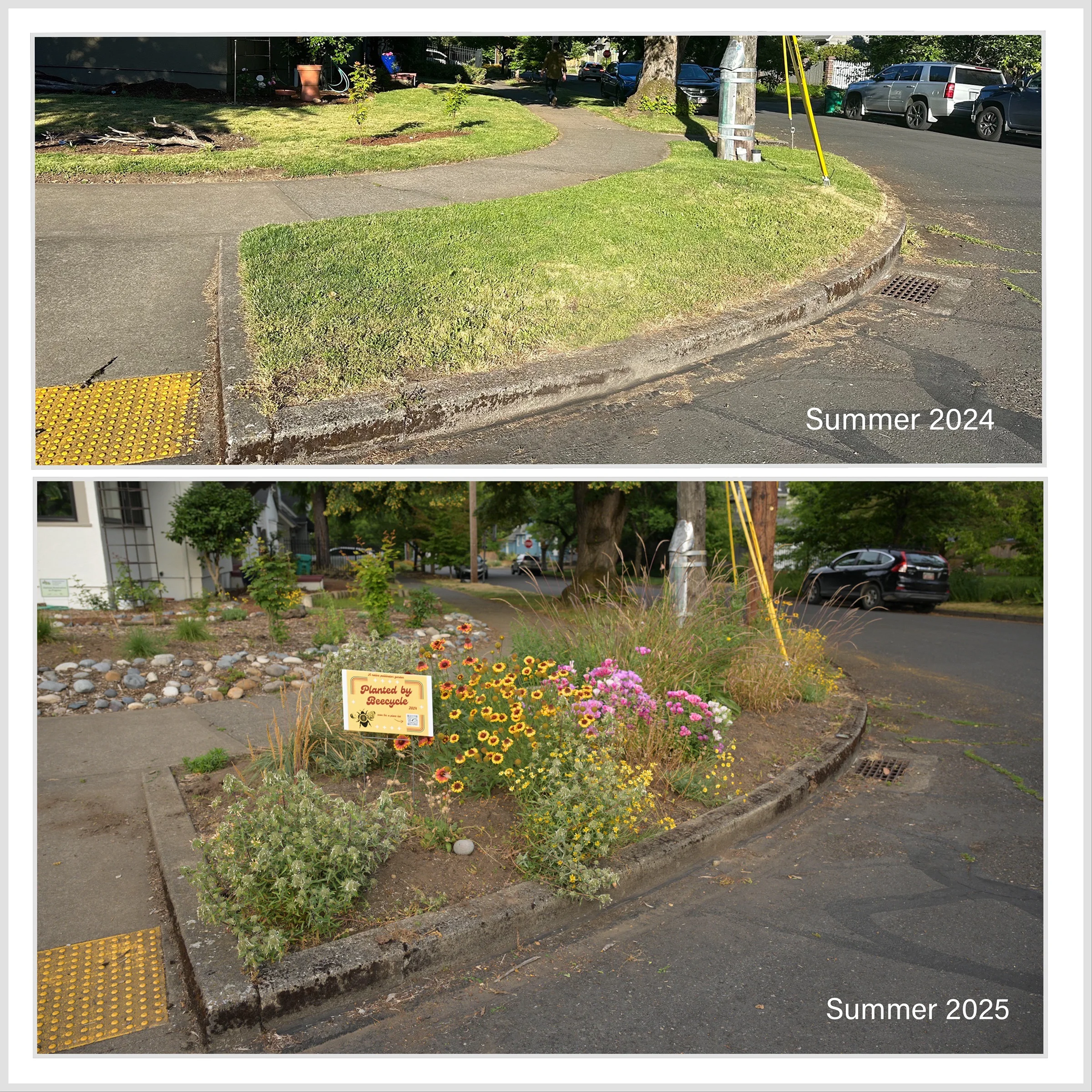 Our goal with the Beecycle is to transform unused grassy or weed-covered areas into accessible spaces where people can see and learn about native plants first hand. Additionally, these native plant gardens provide vital habitat for pollinators and birds within the urban landscape.