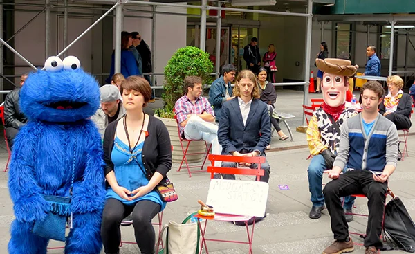 Left: One of BCSA’s first creative actions — a “meditation station” in Times Square.