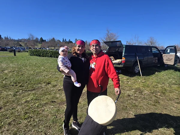 Upper Right: Walptaiksha Drum, Domin Arthur (left) holding granddaughter Ulee, Timothy Burns (right).
